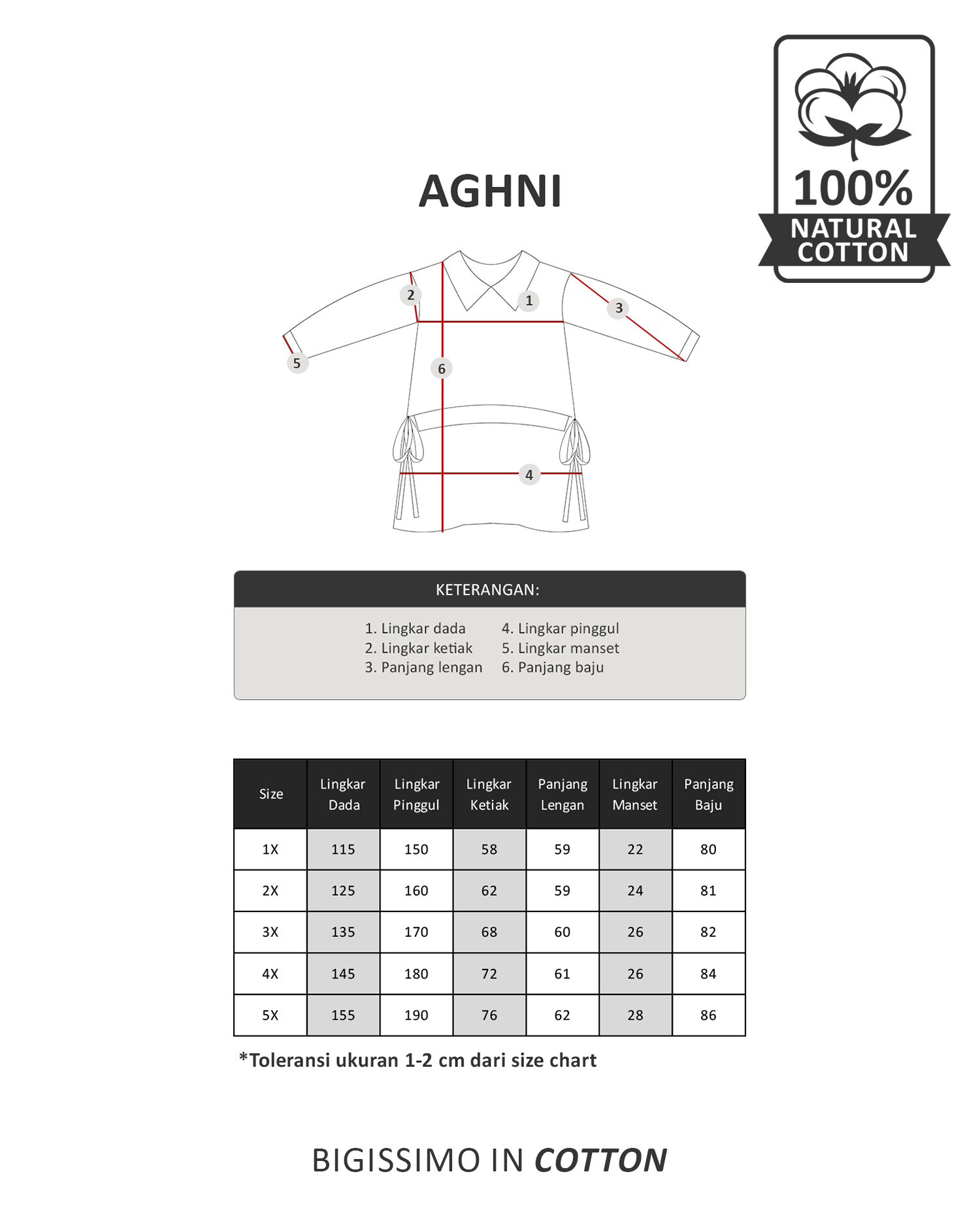 Size (Lingkar dada x Lingkar ketiak x Panjang lengan x Lingkar pinggul x Lingkar manset x Panjang baju)