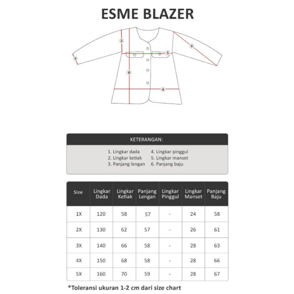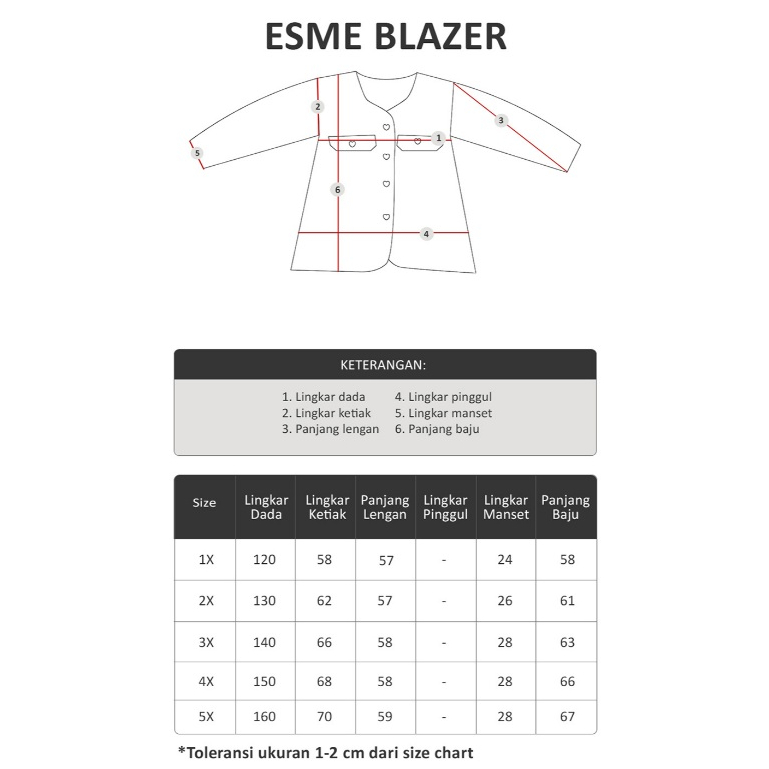 Size (Lingkar dada x Lingkar pinggul x Lingkar ketiak x Panjang lengan x Lingkar manset x Panjang)