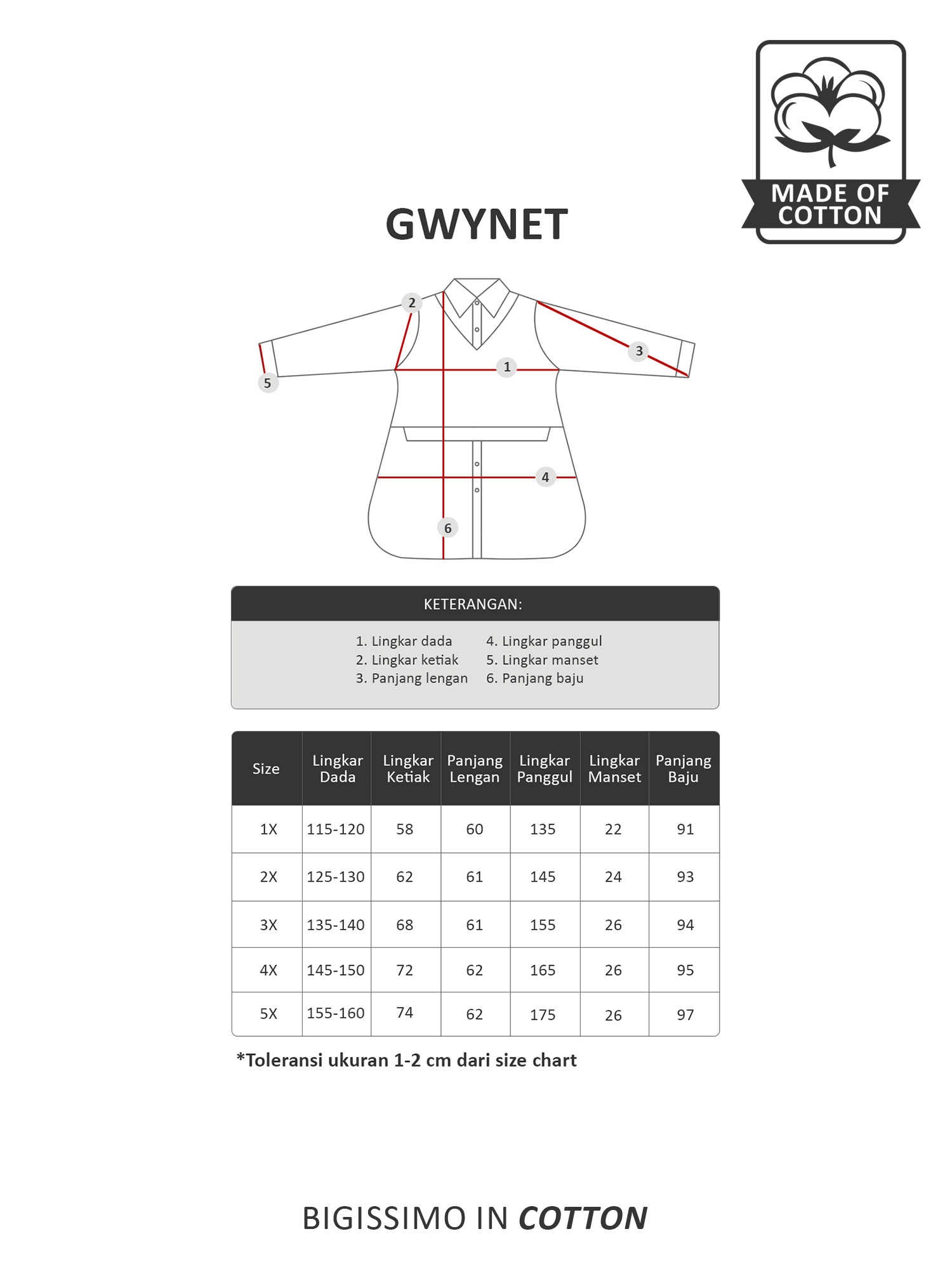 Size (Lingkar dada x Lingkar pinggul x Lingkar ketiak x Panjang lengan x Lingkar manset x Panjang baju)