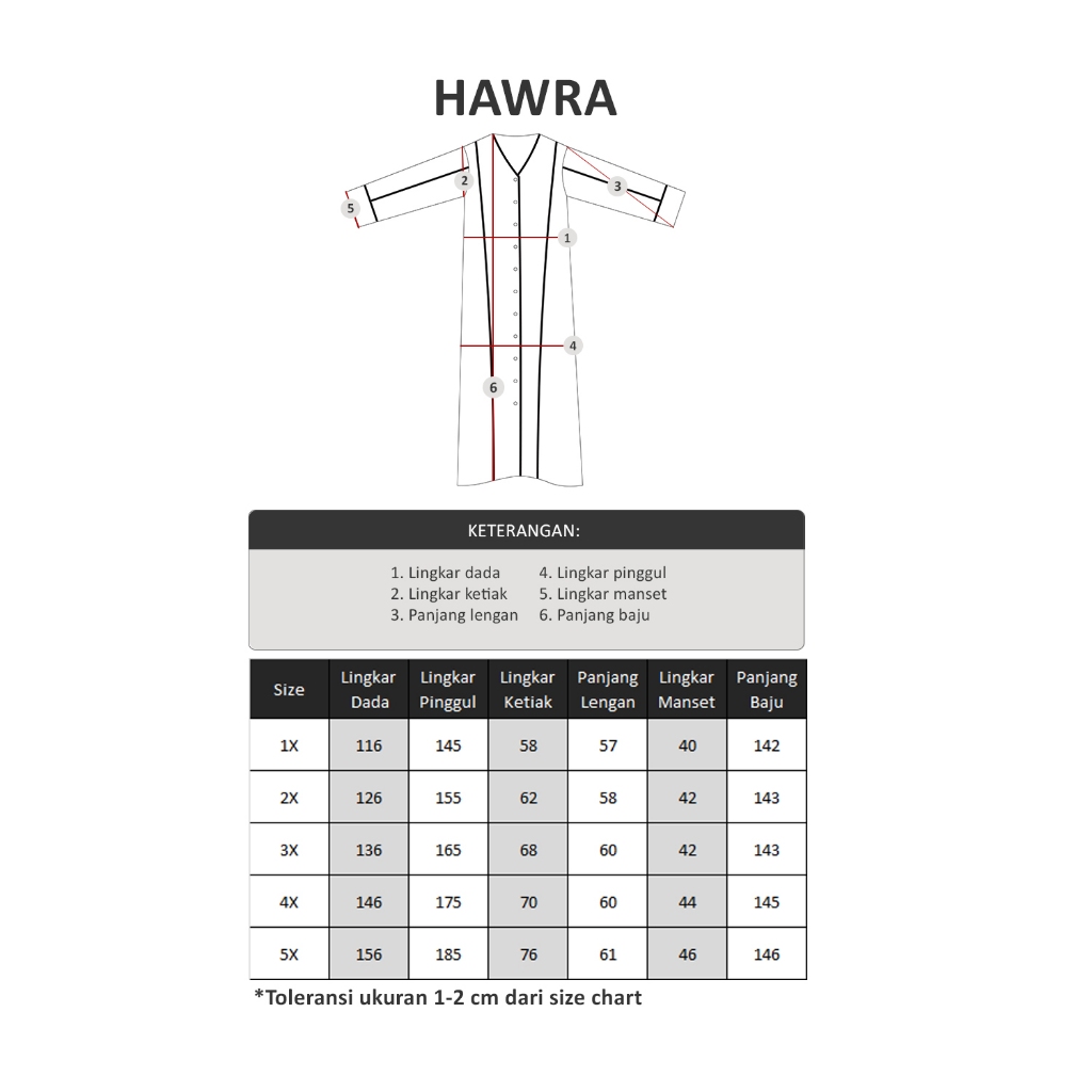 Size (Lingkar dada x Lingkar ketiak x Panjang lengan x Lingkar pinggul x Lingkar manset x Panjang baju)