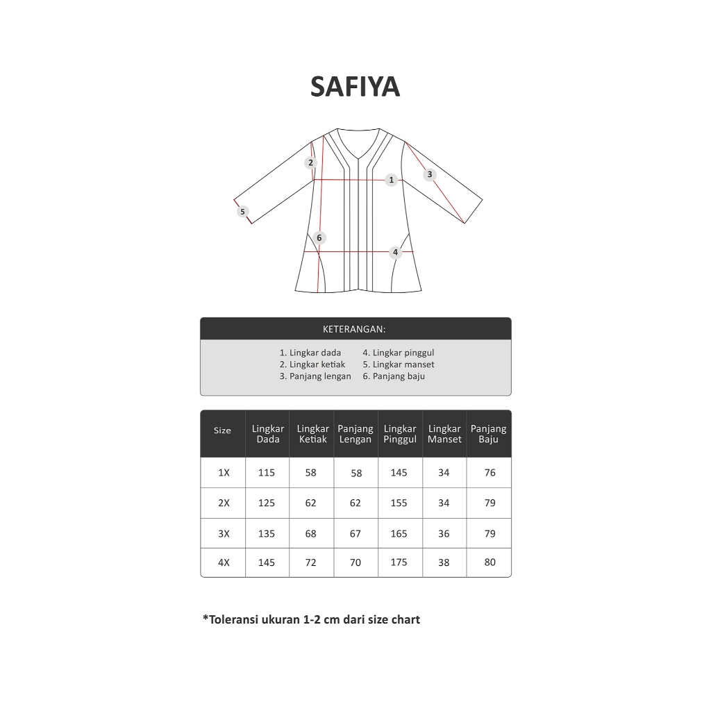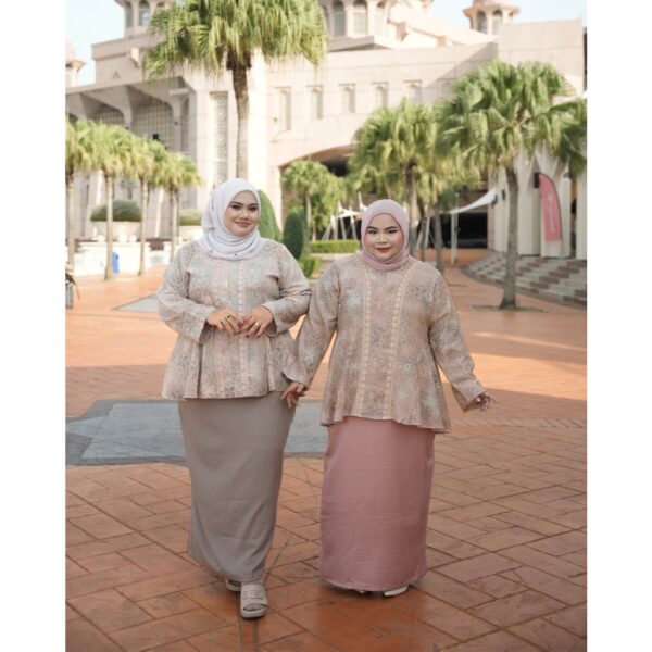 Set Safiya Kurung Melayu hadir dengan tunik bermotif anggun, aksen renda halus, dan rok polos yang jatuh indah.